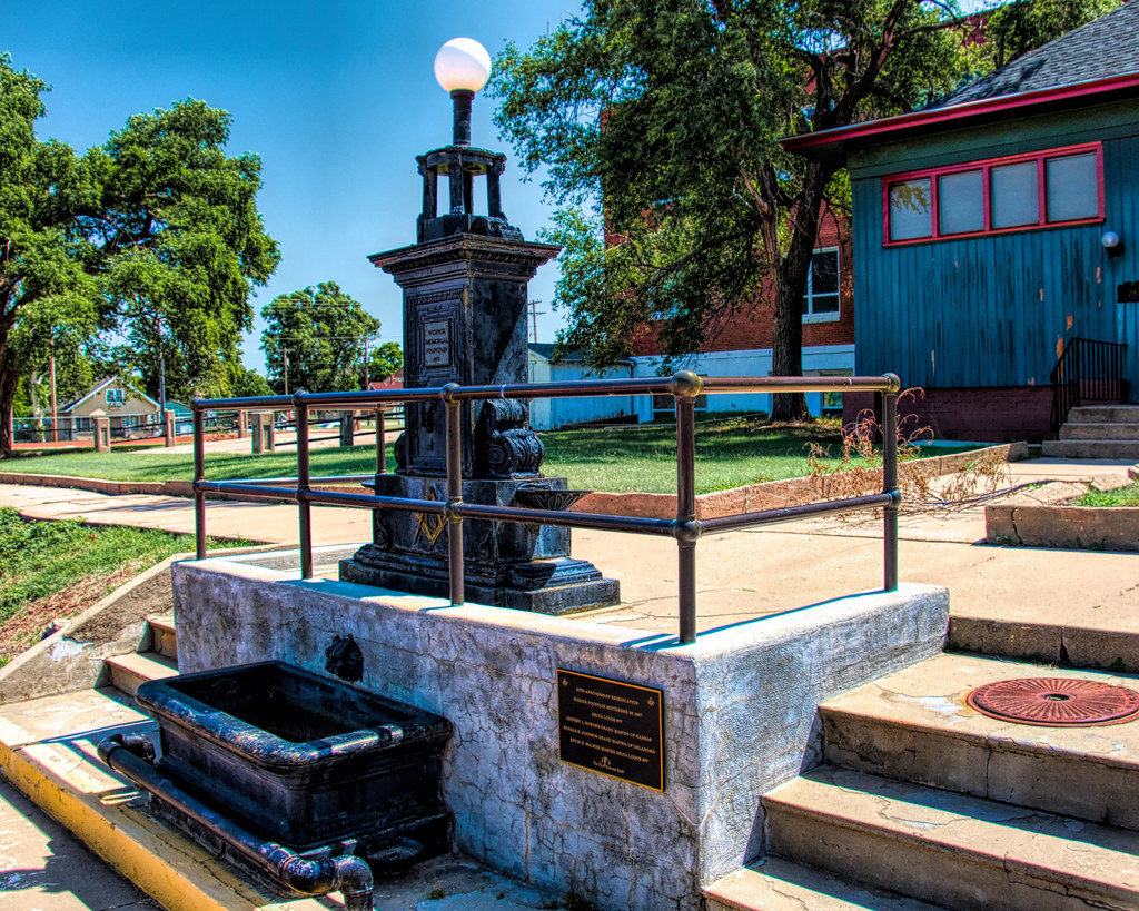 We head on the back roads towards Medicine Lodge. This is a small town that was named after an arbor made of trees and branches that was used by the Kiowa Nation in their sun dance ceremony. One really cool thing to see is the Wisner Fountain, built by masons in 1917. It was used by both horse and humans to quench their thirst. It stands today with minimal restoration, a real tribute to days gone by. There is also a stockade which is now a museum. I didn’t stop in but wish I had. It apparently shows how families lived within its walls from May to September to avoid be attacked on their homesteads. Many men were sent from the stockade as scouts, to cover the miles of territory, looking for potential raiding parties. There are four markers in separate parts of the town to show the approximate size and location of the stockade.