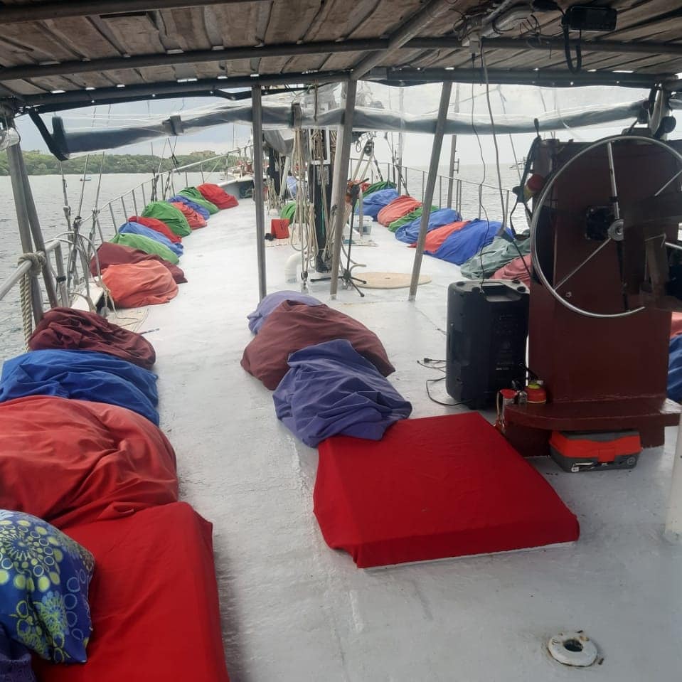 Out of the little boat we climb and onto a rope ladder hanging on the side of the Antartes for us to scramble on board…I am certain my climb did not look smooth or steady to those on shore. We get ourselves seated on comfy cushions and bean bag chairs all around the parameter of the deck of the boat and before the anchor is hoisted, we are handed a signature welcome cocktail. I am loving this adventure already!