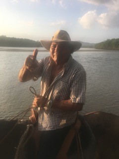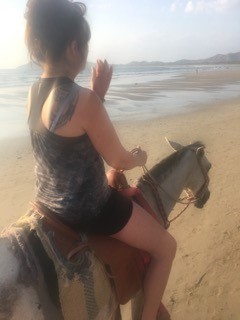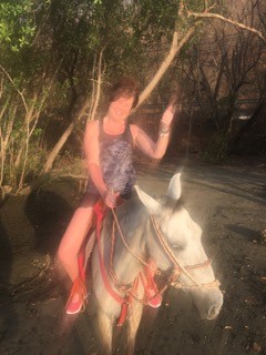 We head to our rooms and quickly freshen up because we are heading to the beach…to ride horses. We chose to use one of the local Ticos and his lovely herd as we had seen them on the beach every day since our arrival. He met us at the Dira entrance on the beach, we saddled up and away we went. All the way down the beach towards the estuary…which you remember is where you might find a crocodile…are you sure about this I am asking myself. Our Tico guide does not speak English, but seems pretty confident about our route and so we follow. He leads us into the bushes a short way and then has us…walk our horse to the waters edge…for a photo. Oh my….all I am thinking is if a crocodile bites my horse…1: I am likely to try and save the horse…2: I am now on the ground with the crocodile…3: I will miss happy hour at Walters and be upset…ok…I am now motivated to get this picture and head back to happy hour in one piece…both me and my trusty steed.