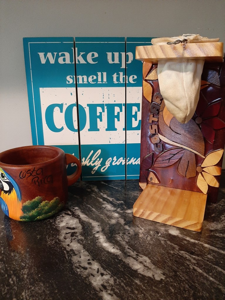 Next we take a little walk through the shops to get a few souvenirs for the grandchildren and I wanted a Costa Rican coffee maker. I use it every weekend and the handmade wooden mug I bought to go with it, and of course my Monkey coffee (read previous blog). All of the Ticos make their coffee this way and it is simple and makes a delicious brew. I look at it on my counter every day and think about my Tico friends.