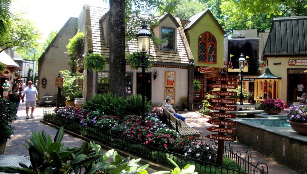 Across the street from our car is the area called The Old World Village. Set back off the main street and housed in some really quaint buildings are over 27 unique shops and restaurants. There is pottery, donuts, jewelry, clothing, candles, coffee, Celtic goods, bath and body and….well, the list goes on. It felt like being transported to Europe to walk through this lovely little area. A few benches placed in the beautiful inner court gardens make it the perfect spot to people watch and to gaze toward the ever looming mountains surrounding this town.