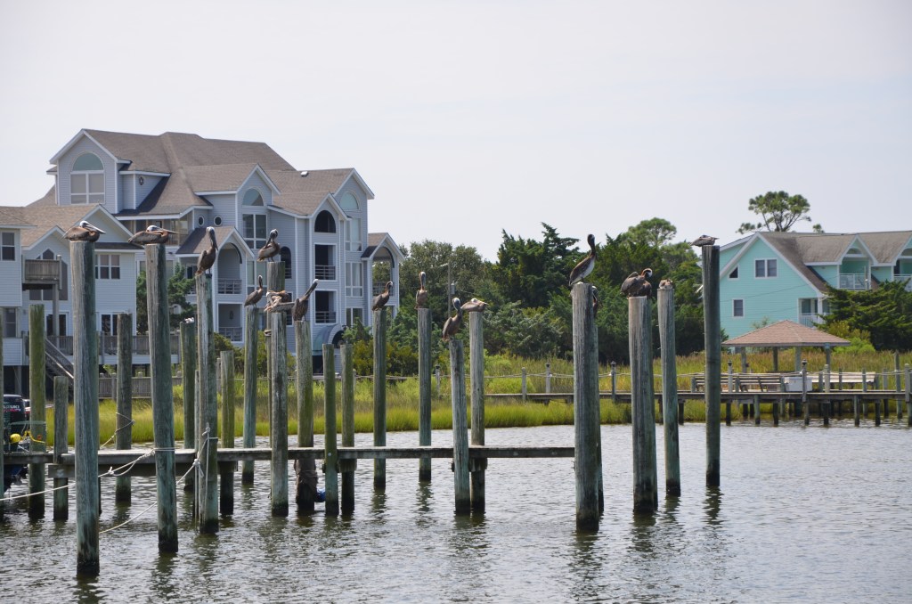 We head out of the musum and walk to the pier to watch a couple of young boys fishing in Pamilco Sound (which surrounds this end of the island). It is here that I fell in love…in love with pelicans. I had never seen one before and there right before me they were flying and diving into the ocean. I was in awe and so darn excited.