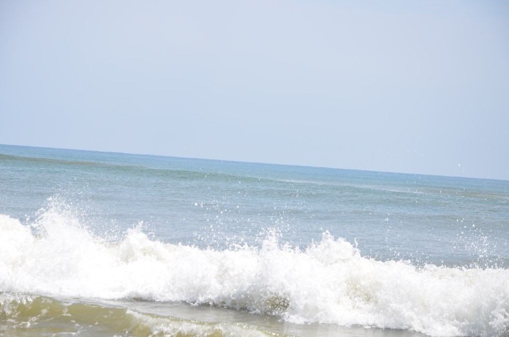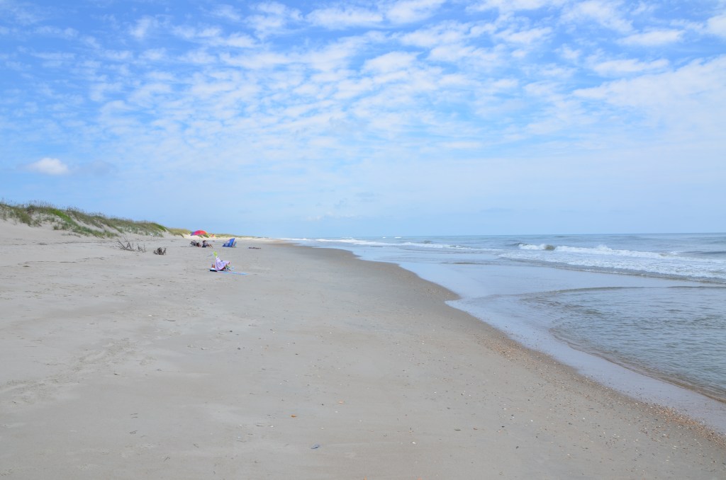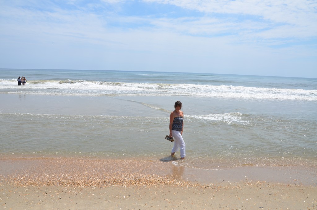 With lunch in my belly, we decide to head back towards the inn, grab the car and head out to see the wild horses on the beach out of town. I stop at a little store and pick up a few souvenirs for myself and my daughter, hop in the car and away we go. There are wild mustangs here on the OBX…specifically in Corolla and on the beaches just outside of Ocracoke Village…..that is where we are headed. We park in the parking lot of what looks like a corral and I read the sign on the fence. This is the housing area that is 100 acres, where the wild mustangs are enclosed to keep them safe from storms and tourism…sad. They range free here but they are so far back from the road, I do not get to see any. I am just happy that they are protected and safe…and free. We cross the road and head over the massive sand dunes to check out the Atlantic ocean. I can’t resist and off come my shoes and into the water go my toes…only toes because the Atlantic is always cold. It so beautiful to stand there, appreciating the vastness and power of the water, the heat from the sand, the creation by nature of the sand dunes and the serenity of it all….I do so love it here.